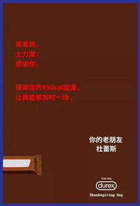 在去年感恩节,杜蕾斯感谢各大品牌的文案至今仍被网友津津乐道。杜蕾斯给士力架的感谢信是“亲爱的士力架,感谢你的490cal能量,让我能够加时一场。”只有老司机才能把车开得这么稳!